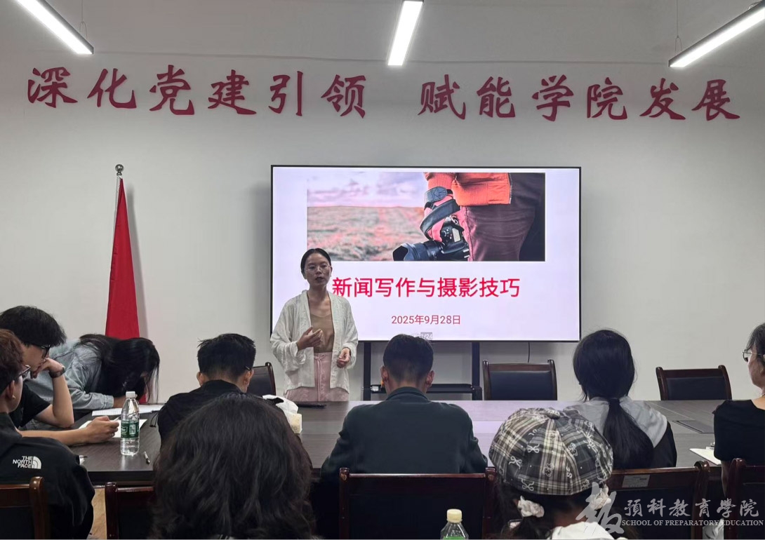[预通社]2025年9月28日18:20,预科教育学院组织学院宣传部成员及各班宣传委员在北校区106会议室开展新闻写作与摄影技巧培训。培训会由学院党总支宣传委员兼第一党支部宣传委员杨陈老师主持并主讲。